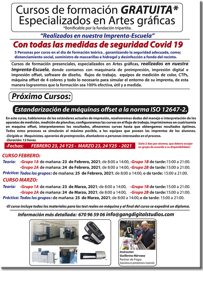 Cursos de formación presenciales, especializados en Artes gráficas, realizados en nuestra Imprenta escuela, donde contamos con maquinaria de preimpresión, impresion digital e impresión offset, software de diseño, flujos de trbajo, equipos de medición de color, CTPs, máquina offset de 4 colores y todo lo necesario para simular el entorno de su imprenta, de esta manera lograremos que la formación sea 100% efectiva, util y a medida. Próximos cursos Febrero y Marzo 2021: